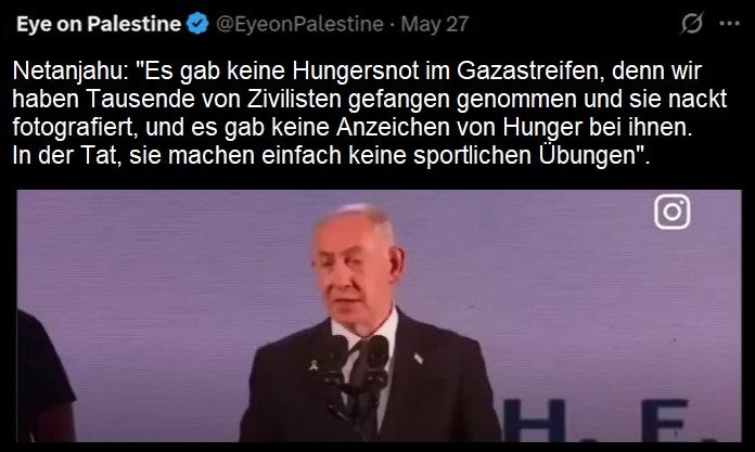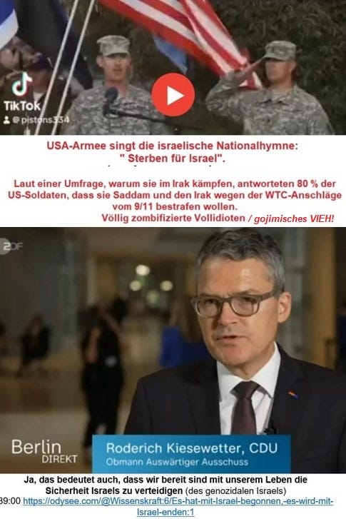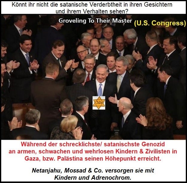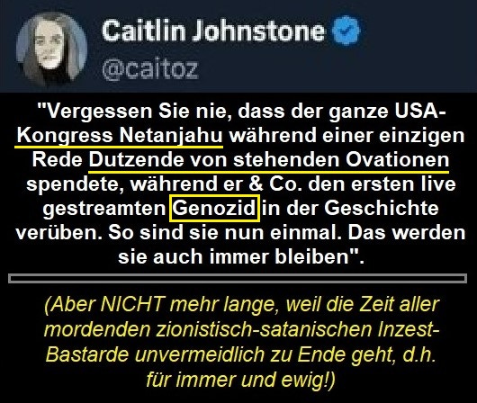 Nur deshalb können sie (die Kleinen, Grossen, Männlichen und Weiblichen) ihren Völkermord an dem kleinen und schwachen palästinensischen Volk ... an Zehntausenden von Kindern, mit den zerstörerischsten Bomben und auch durch Verhungern, völlig scham- und skrupellos, ihre satanische Bestialität mit Gesang, Musik und Freudentanz feiern ... ganz öffentlich/ vor den Augen der ganzen Welt ... während ihre westlichen Verbündeten und Mittäter das ebenso schamlos und bestialisch-satanisch als das jüdische Recht auf Selbstverteidigung rechtfertigen.